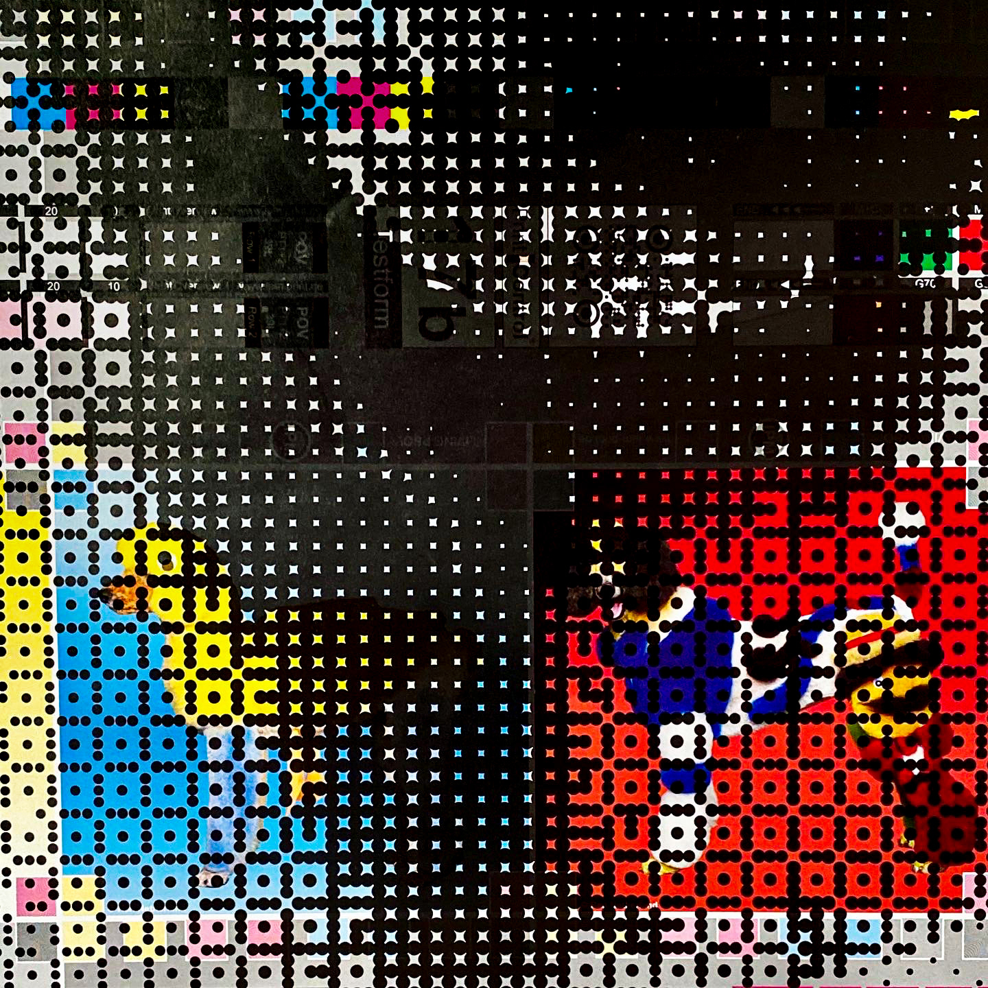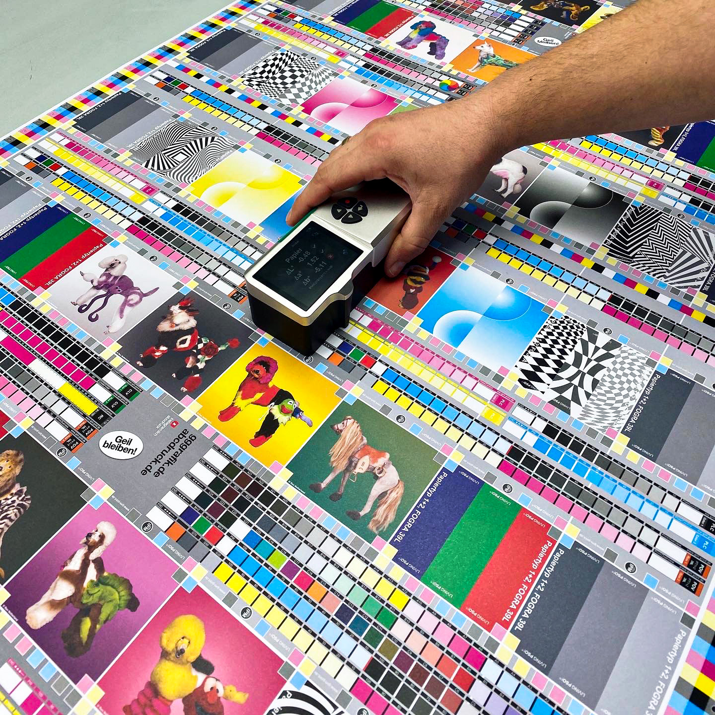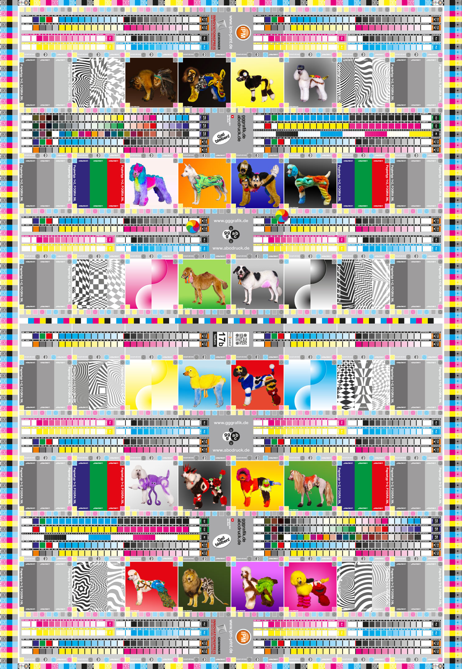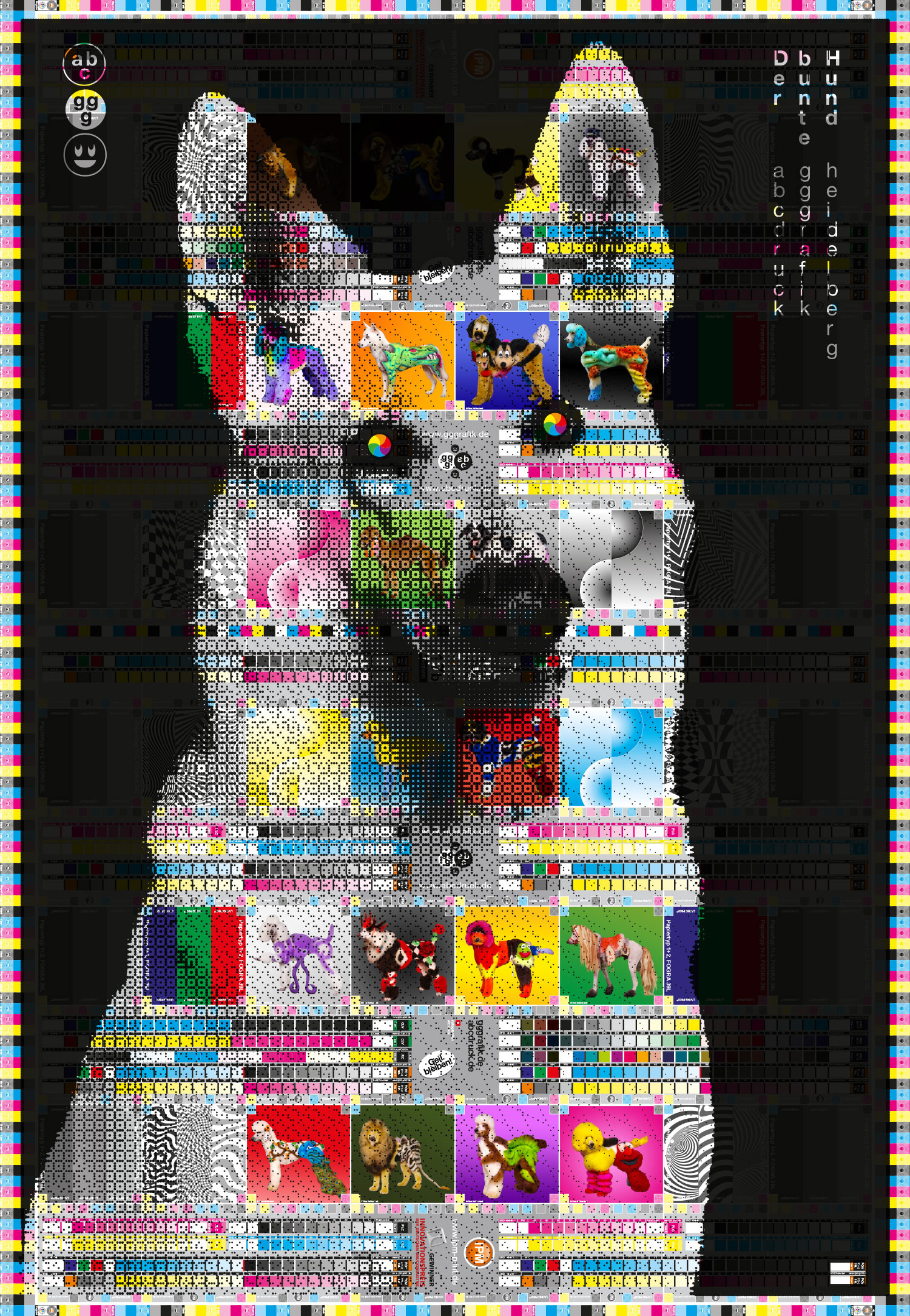 Initially I had only planned on printing onto the sheets, but within the process I was given the opportunity to incorporate some elements of my own. Subsequently a final layer was printed, after the machines had been successfully calibrated. The negative form of the dog brings out the colorful elements and the final result is great advertising for the printers and myself, as well as awesome gift wrapping paper. Classic upcycling!