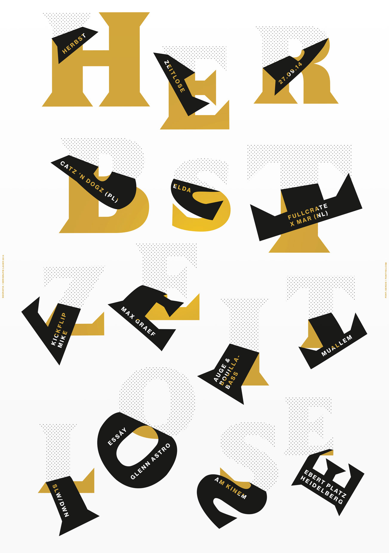 Black and gold silkscreen printed poster for the annual Herbstzeitlose event. The image of falling Autumn leaves is further evoked through the animated version.