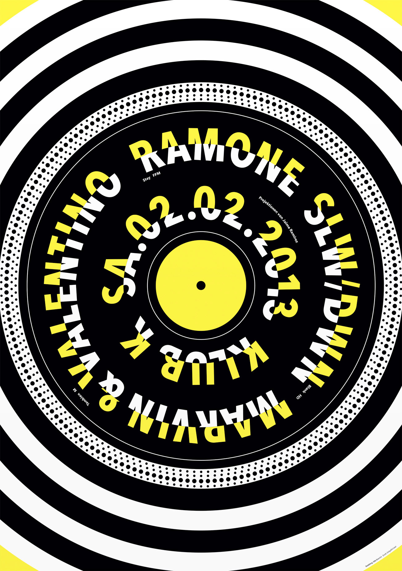 SLW/DWN, Marvin & Valentino, Ramone — SA 02.02.2013. Neon yellow and black, silkscreen printed, limited run poster, for Klub K in Heidelberg.