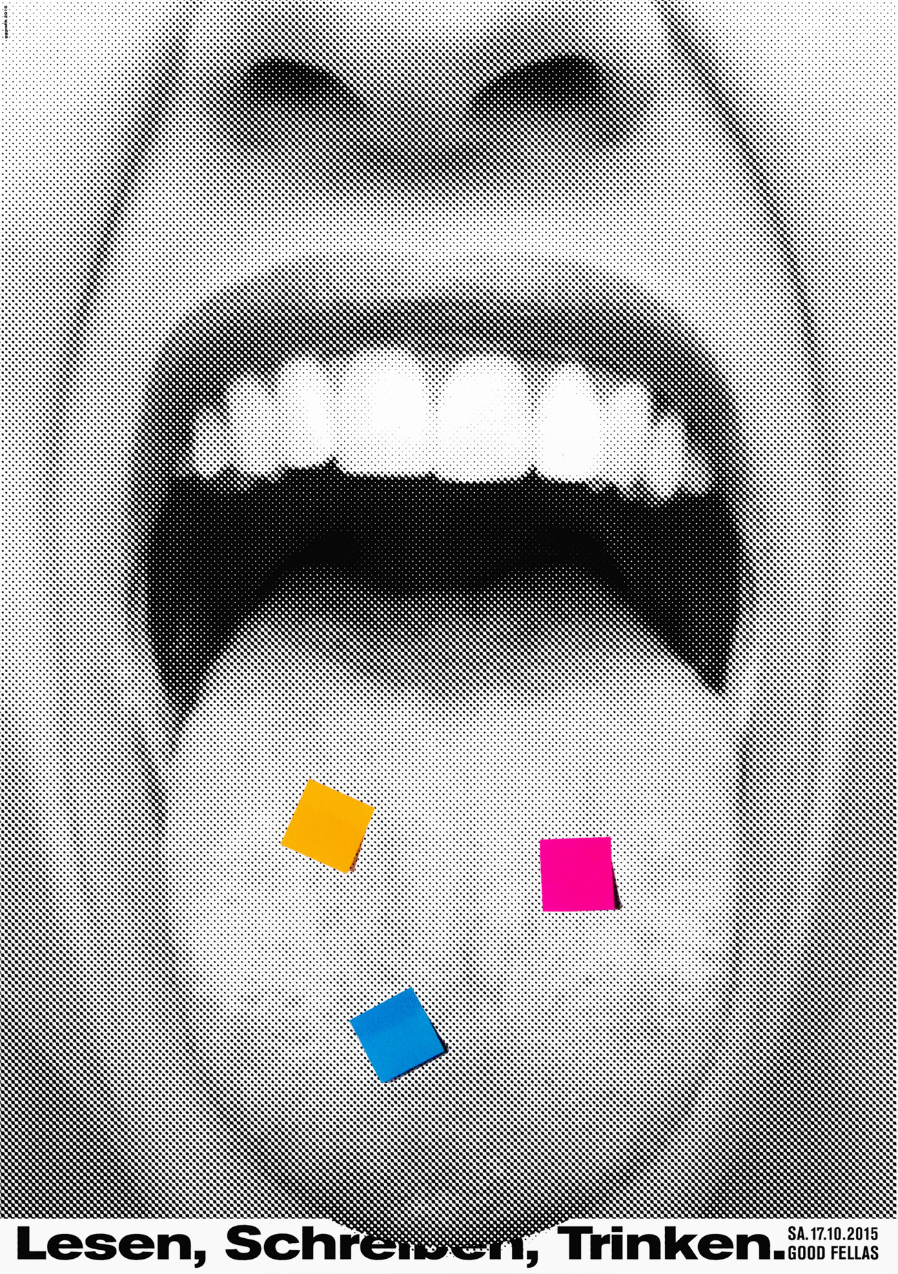 This poster was created for an event, which brings together people for an evening of jolly writing, drinking and reading shenanigans. The post-it notes were physically attached to the posters after printing, for a special effect.