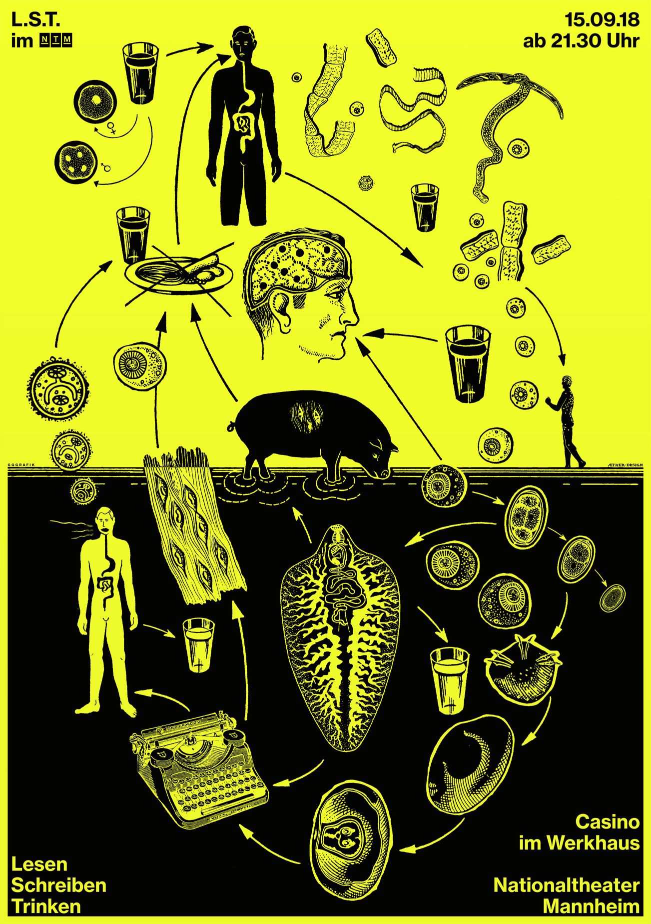 Poster for the L.S.T. (Lesen, Schreiben, Trinken) event at Nationaltheater Mannheim. Black print on fluorescent yellow paper.