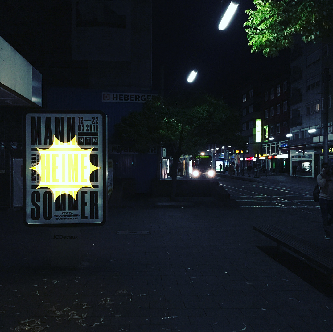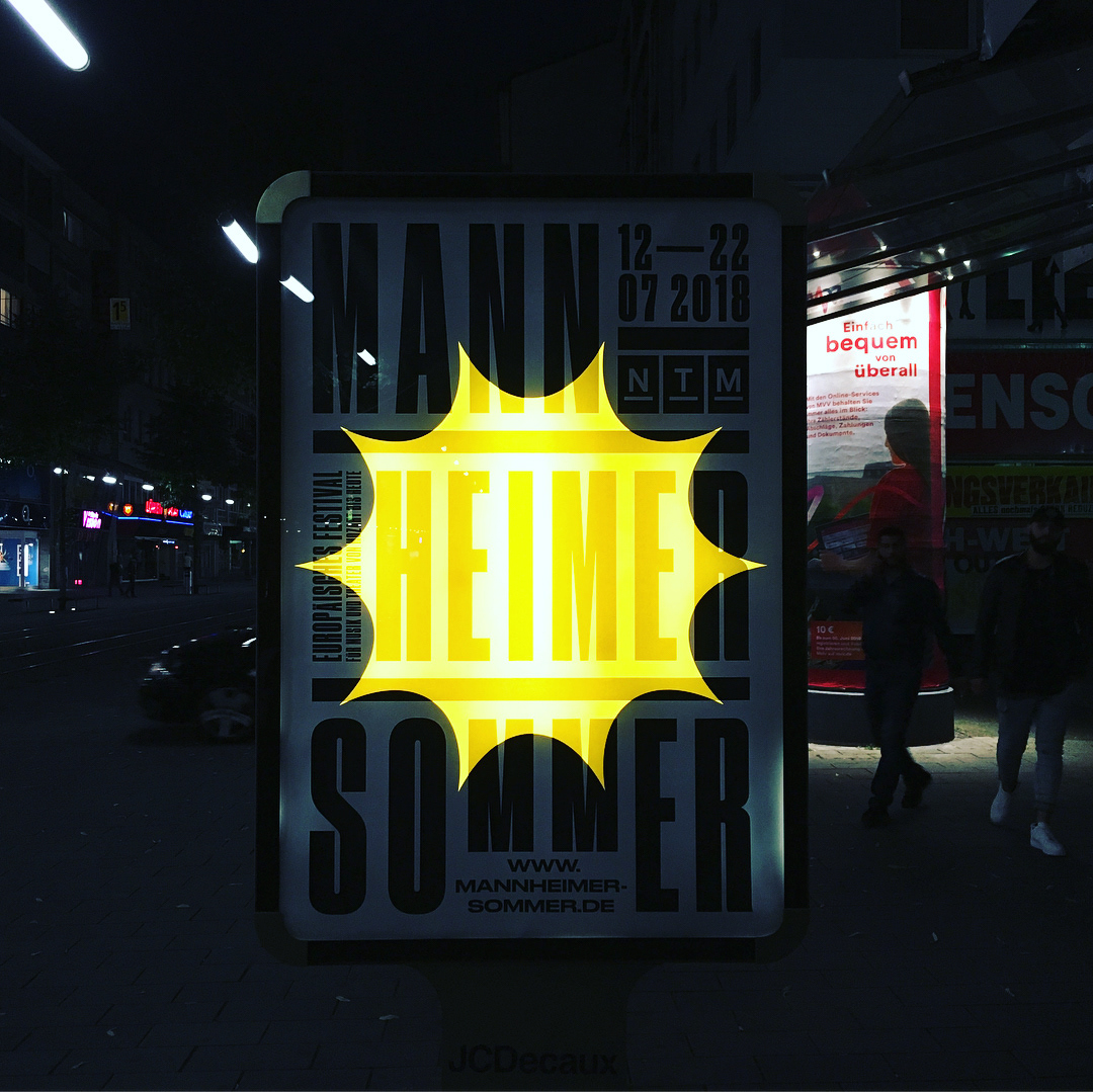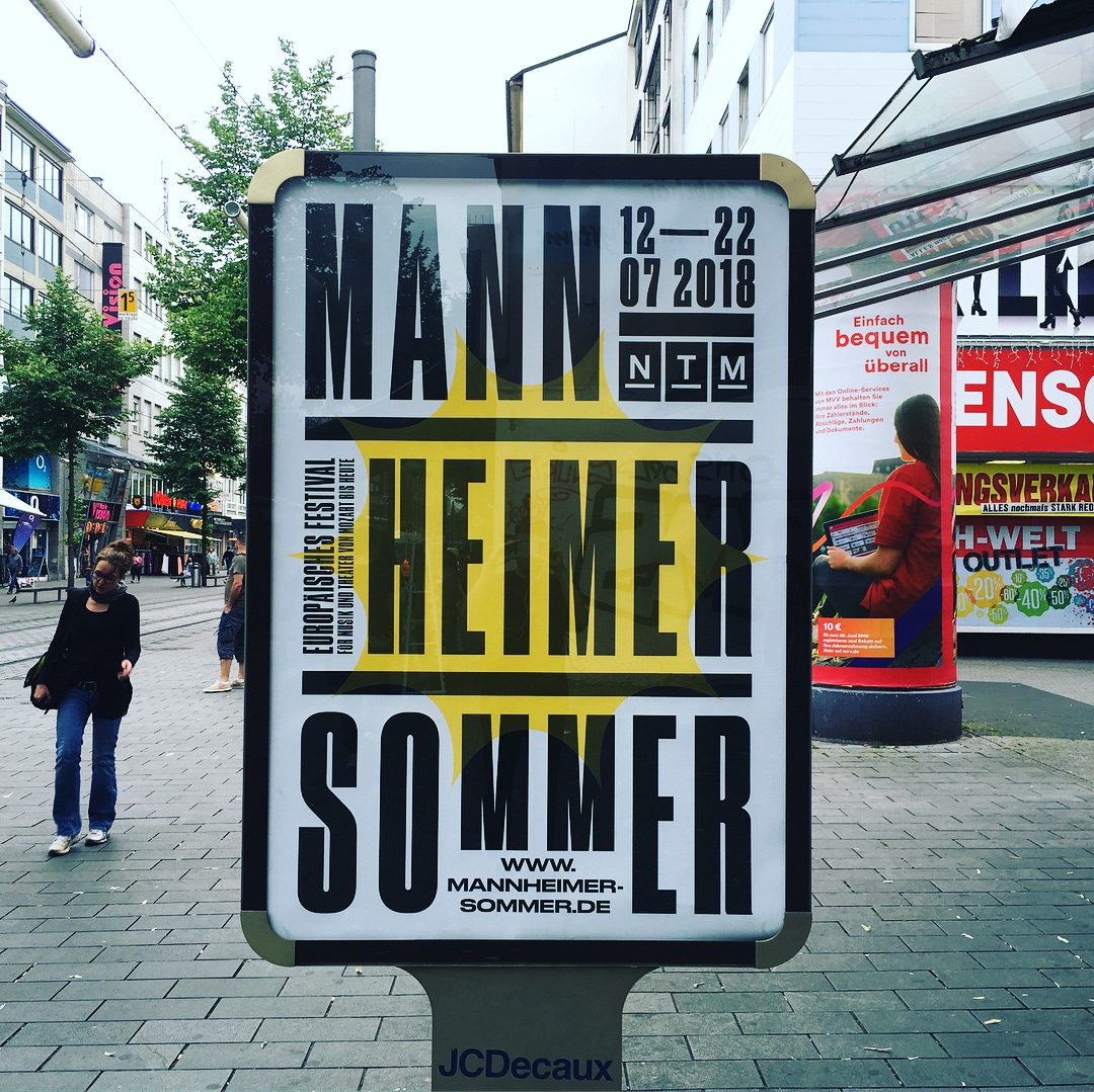 For the Nationaltheater Mannheim we created the complete design concept and realized a multitude of print and digital media for the Mannheimer Sommer festival 2018. This included posters of all sizes, huge flags, a catalogue and citylights with a day/night effect.