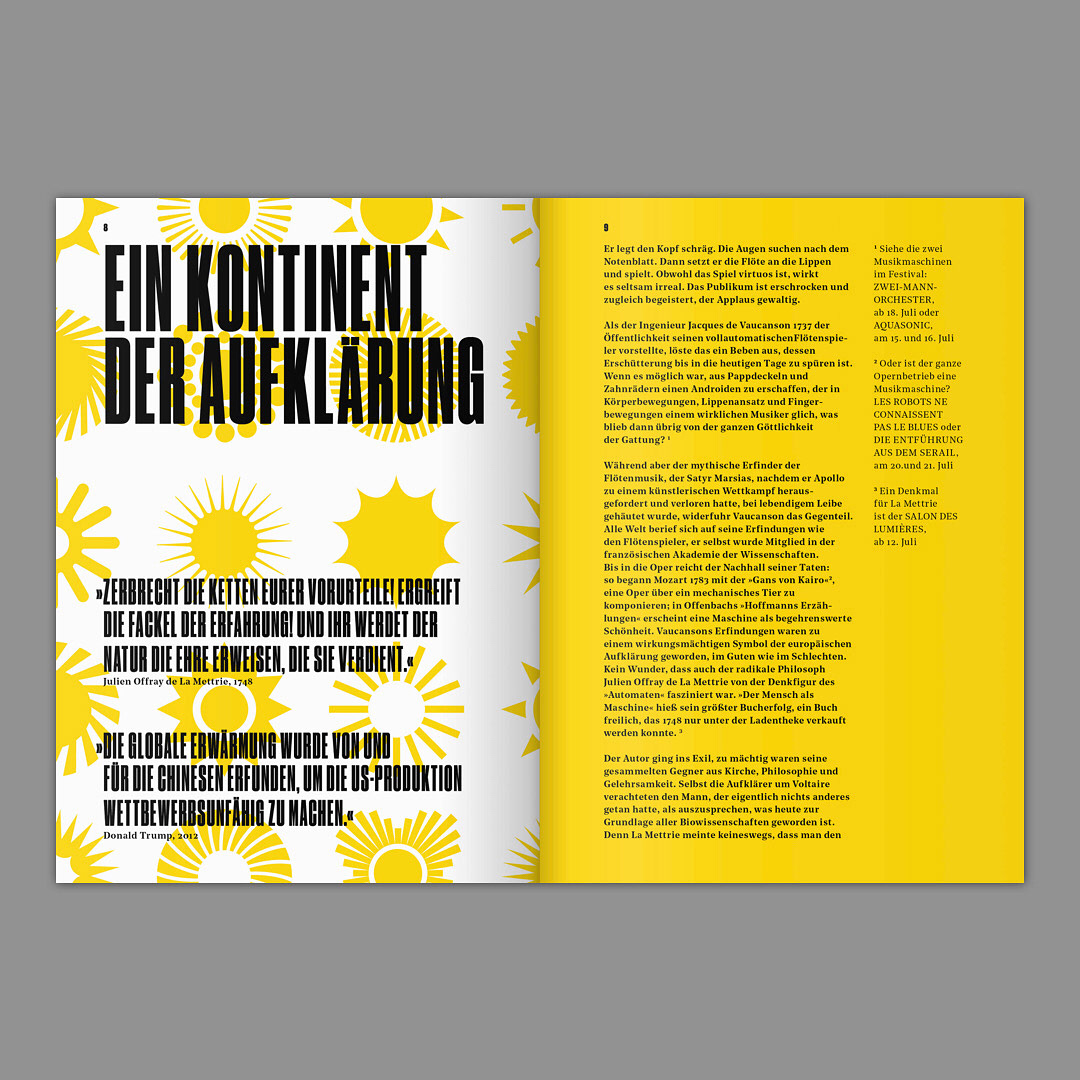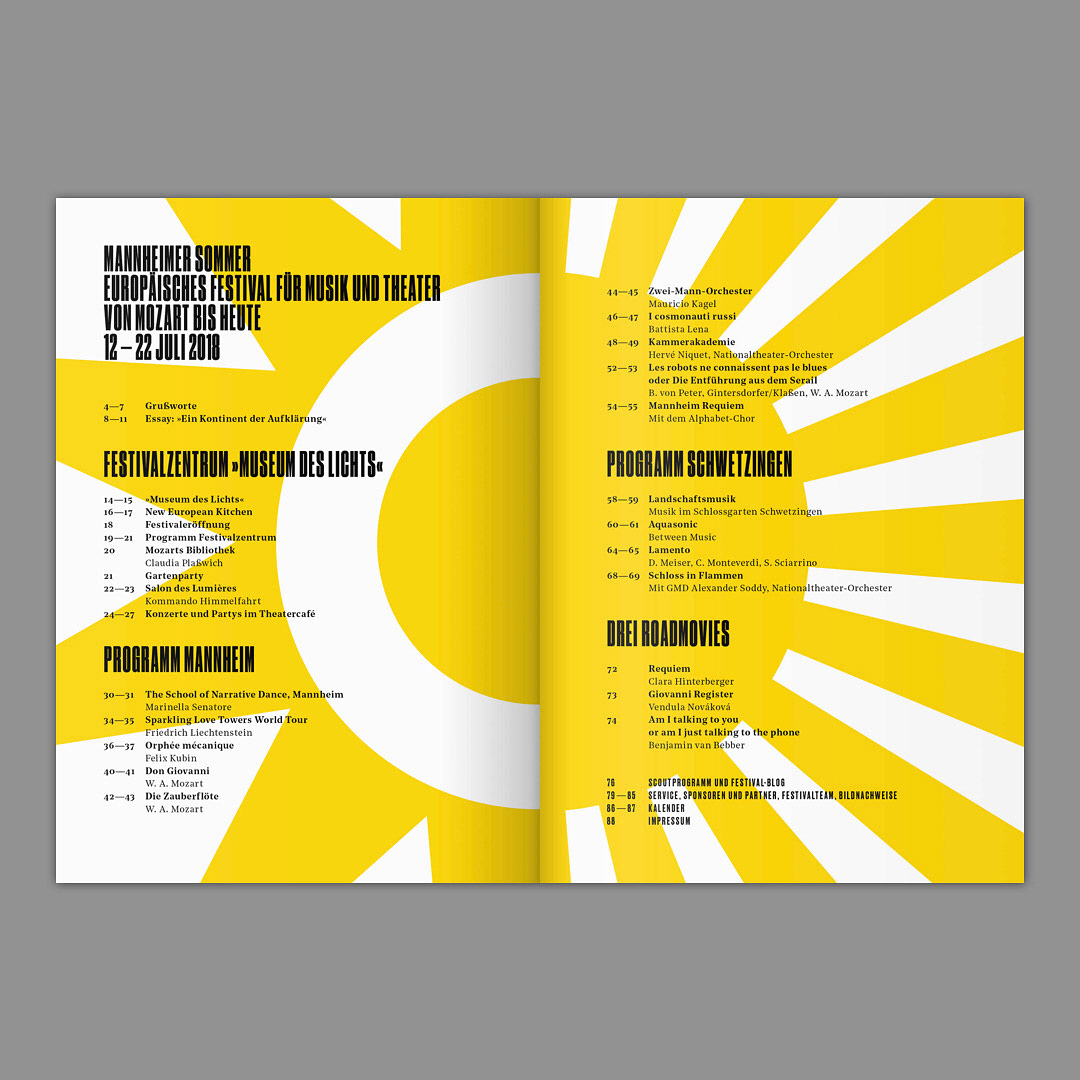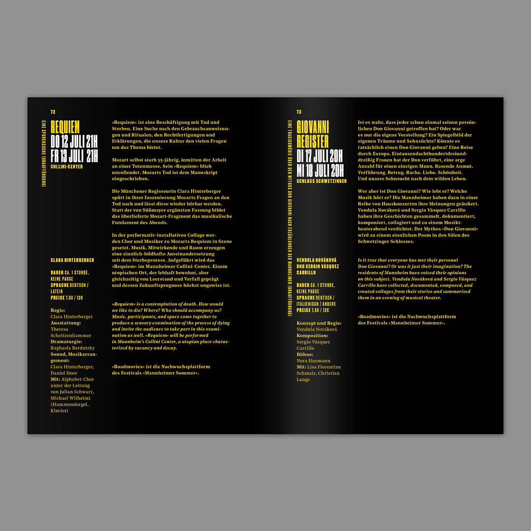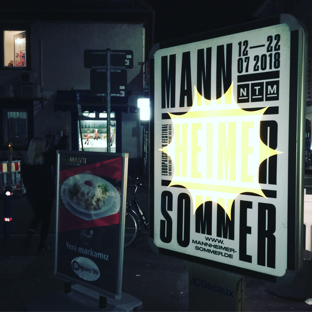 For the Nationaltheater Mannheim we created the complete design concept and realized a multitude of print and digital media for the Mannheimer Sommer festival 2018. This included posters of all sizes, huge flags, a catalogue and citylights with a day/night effect.