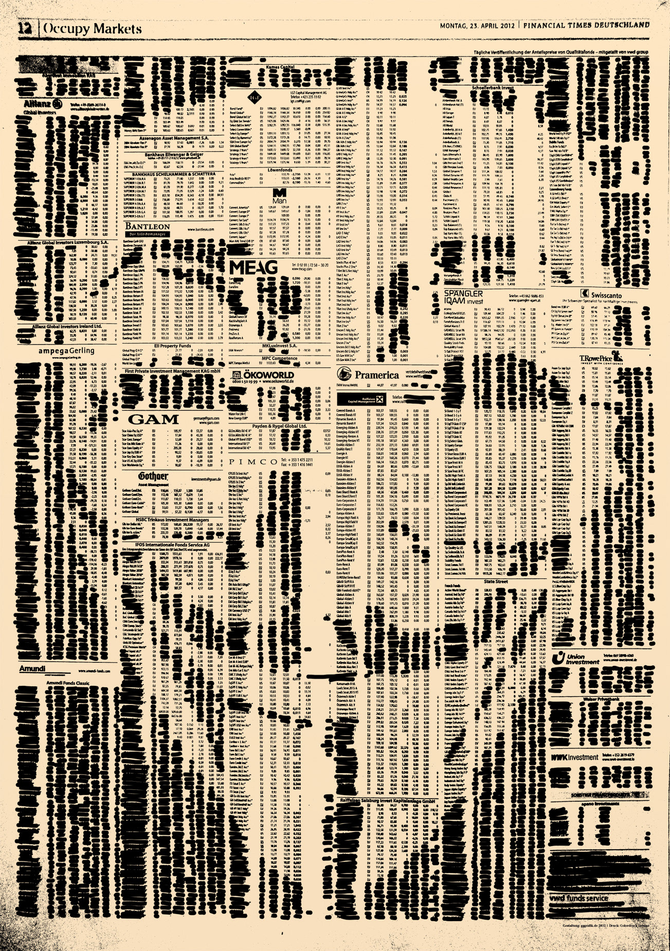 Poster for the "Occupy: whats next?" initiative by nextbydesign. A redacted page of the Financial Times Germany, generates the symbol of the occupy movement. Chosen for an Adbusters-Magazine cover.