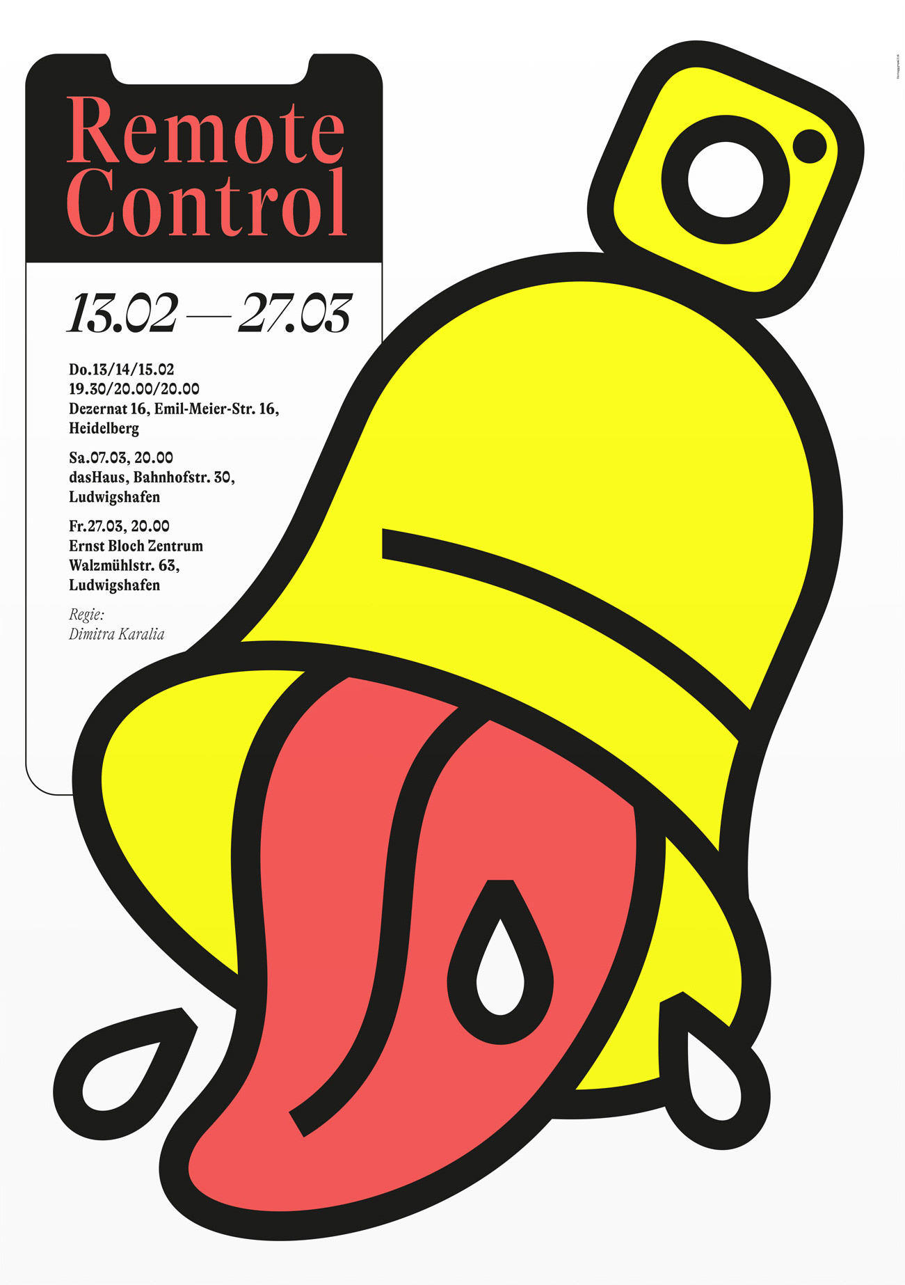 Poster for the play "Remote Control", which deals with the seductive force of social media, which turns us into remote-controlled bots, high on serotonin. We voluntarily contribute the content that makes us want to constantly revisit the app. Like a Pavlovian dog, ringing the bell itself!