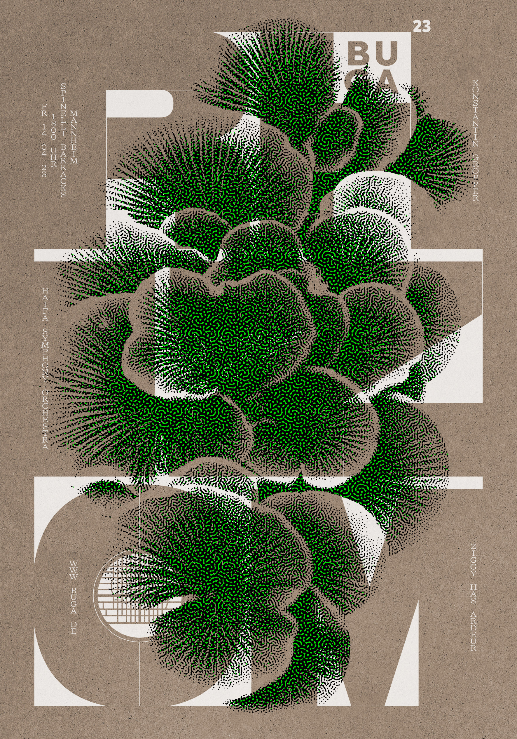 Poster for the wonderful opening concert of the german national gardening show (buga23) with the Haifa Symphony Orchestra, Ziggy Has Ardeur and Konstantin Gropper. the theme was rhizom, the modified subterranean plant system which connects everthing. 70x100cm, three-colour screenprint on silphie paper, made from the fibres of the danube silphie flower.