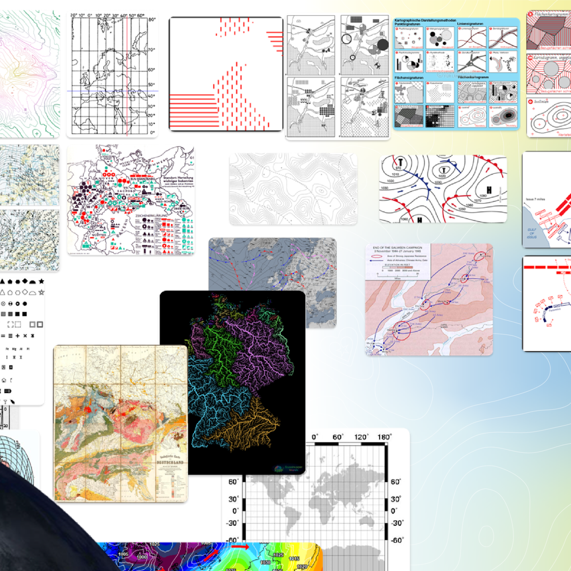 Elements that represent cartography and mapping are merged with vibrant color-gradients that represent transformation and fluidity, as well as with complex illustrations.