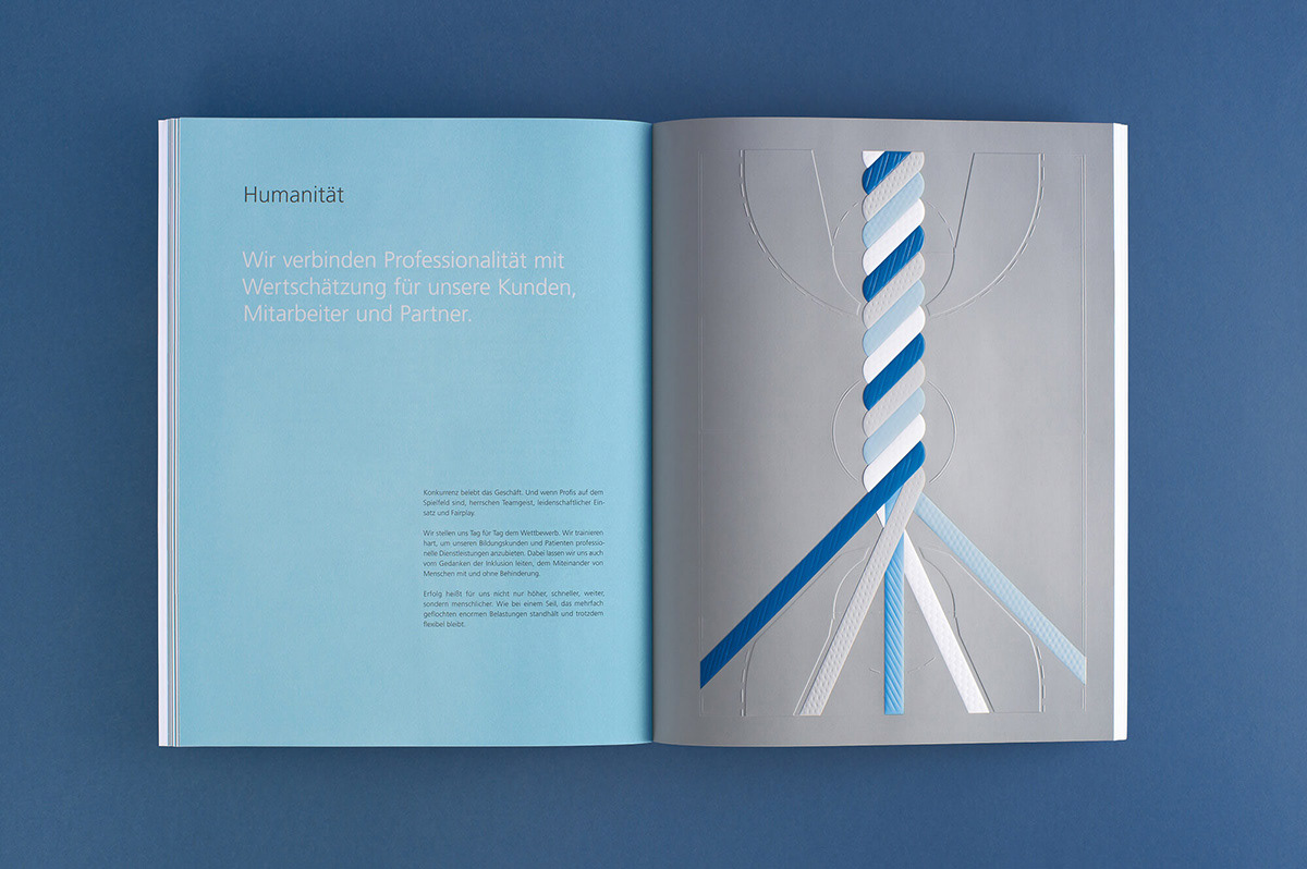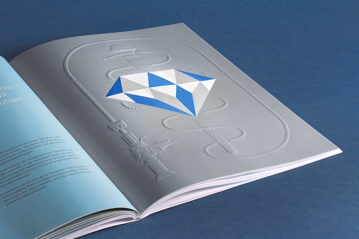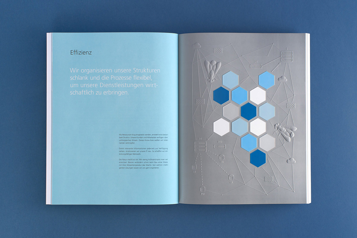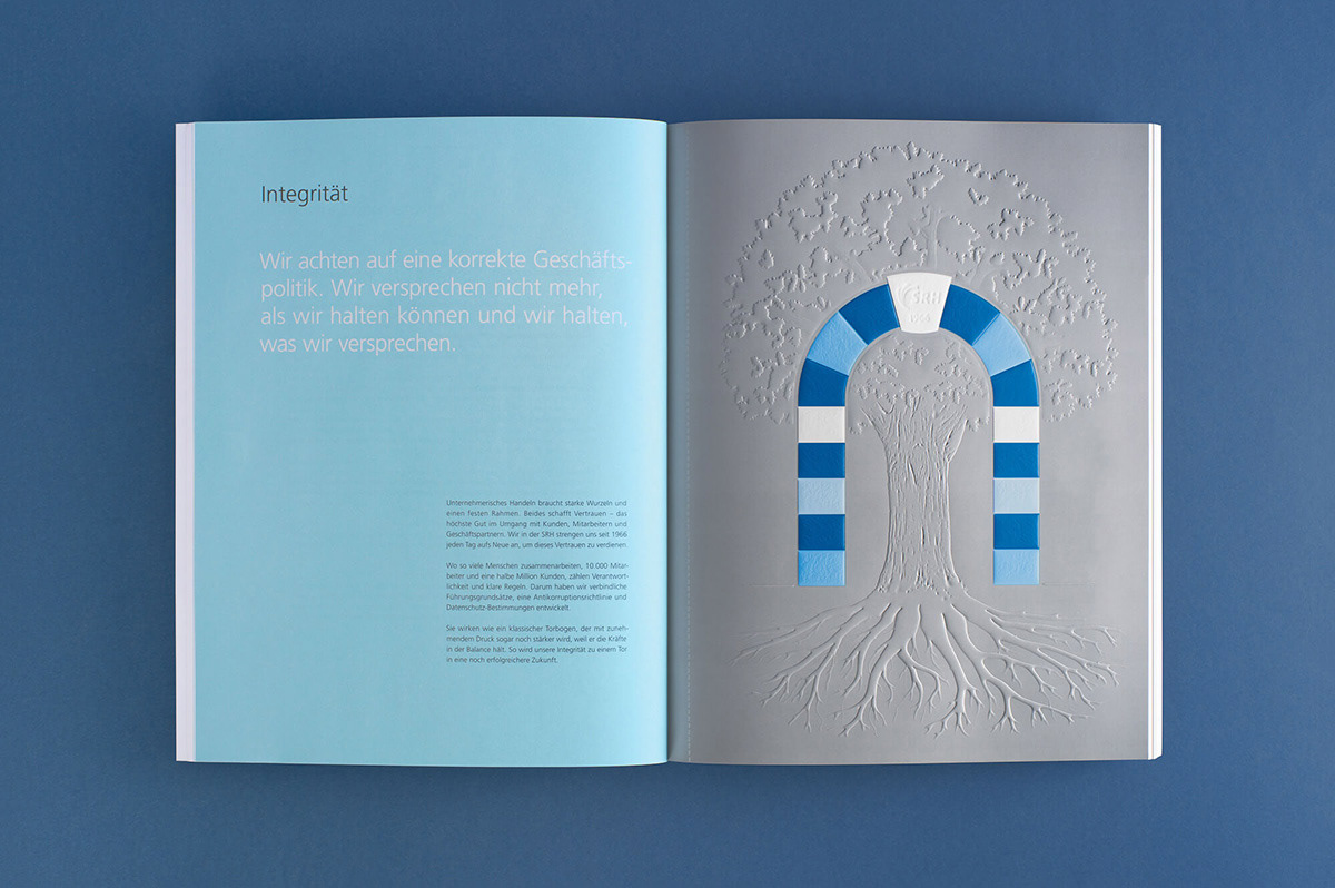 We used simple, symbolic icons and very fine embossings to communicate the values of SRH in a very senseful way.