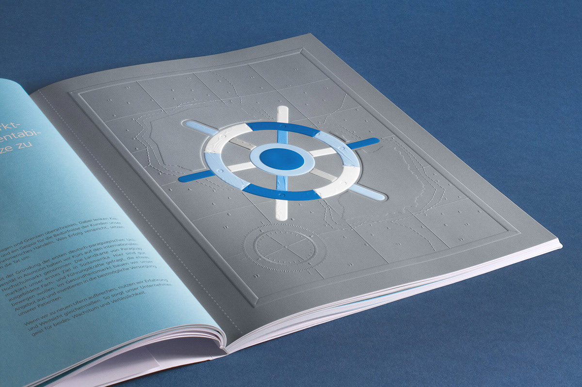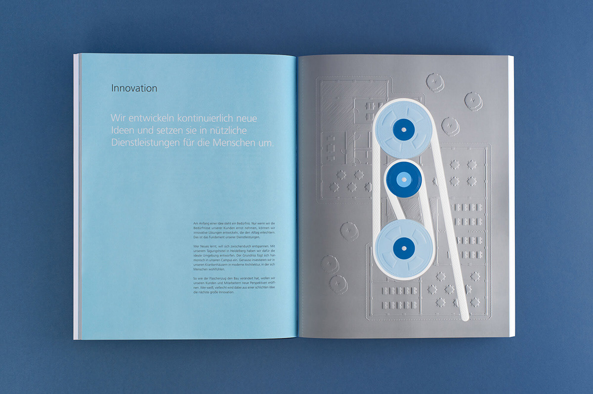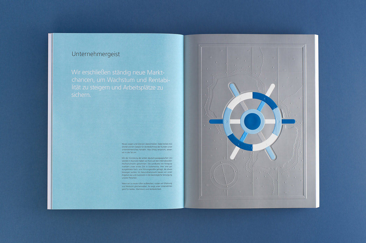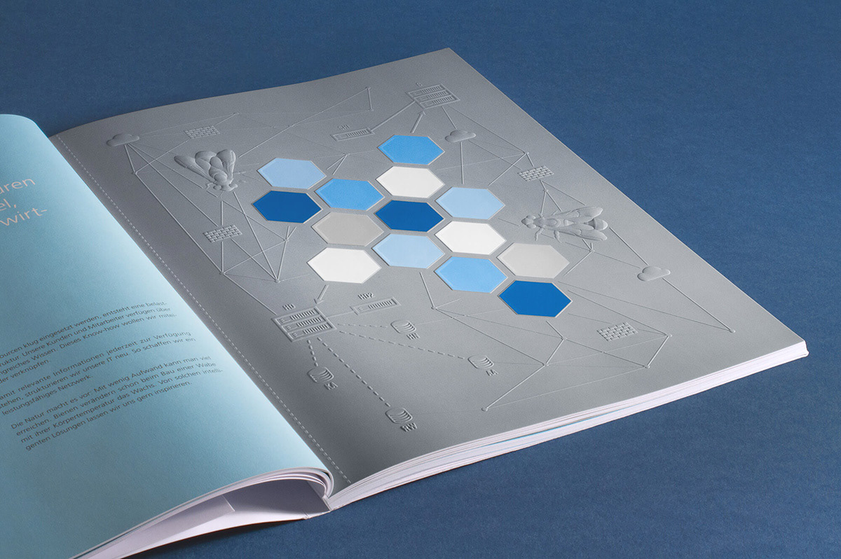 We used simple, symbolic icons and very fine embossings to communicate the values of SRH in a very senseful way.