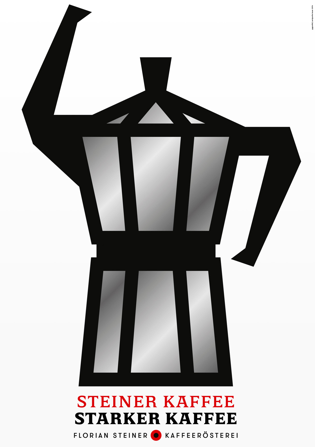 Poster for Florian Steiner Kaffee. A slight alteration of an iconic coffee maker was all it needed, to formulate this striking image. The poster was printed in a three-color silkscreen process.