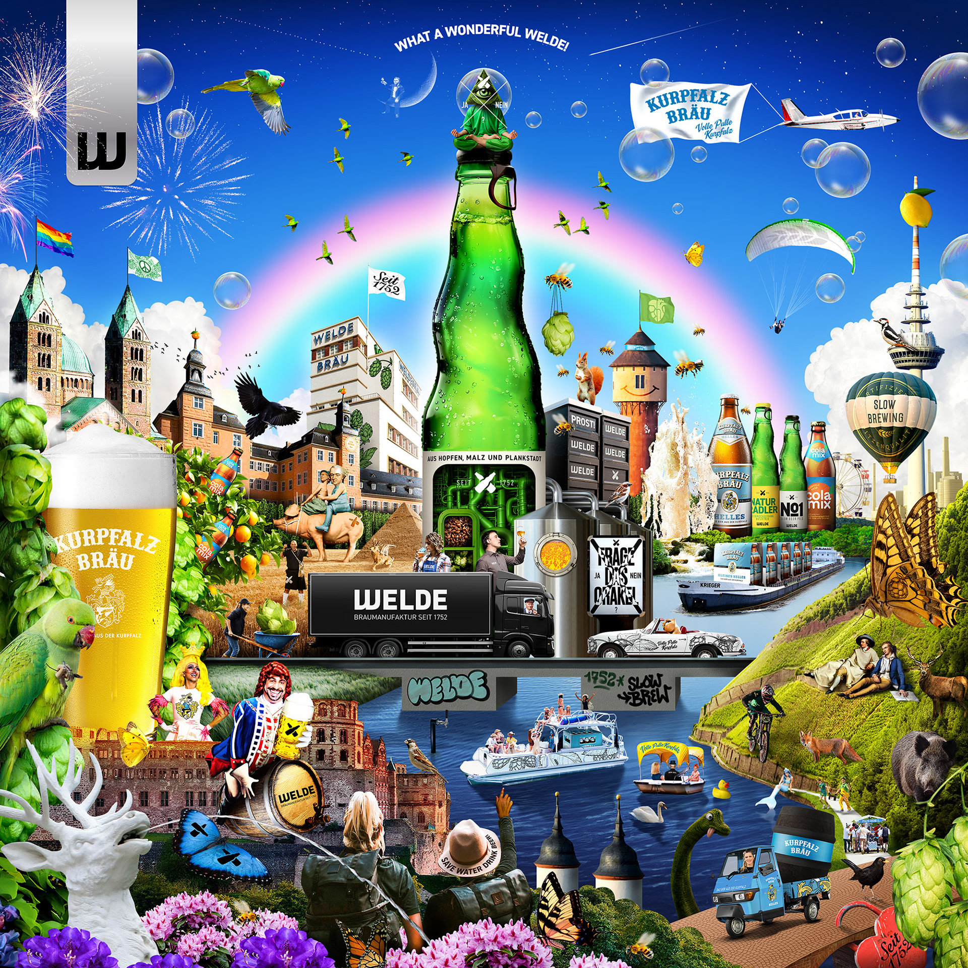 To pay tribute to the commitment, love and passion of the WELDE brewery and to offer visitors to the in-house beer garden in Plankstadt an unmistakable eye-catcher, we created a picture that summarises the many facets of the brewery's philosophy and history in a single dazzling image.
